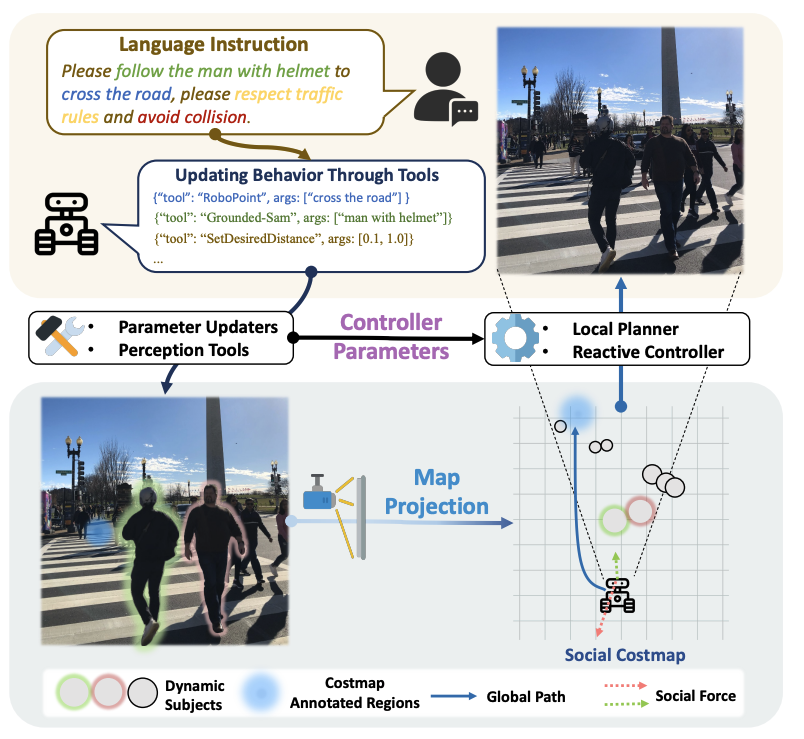 LISN: Language-Instructed Social Navigation with VLM-based Controller Modulating